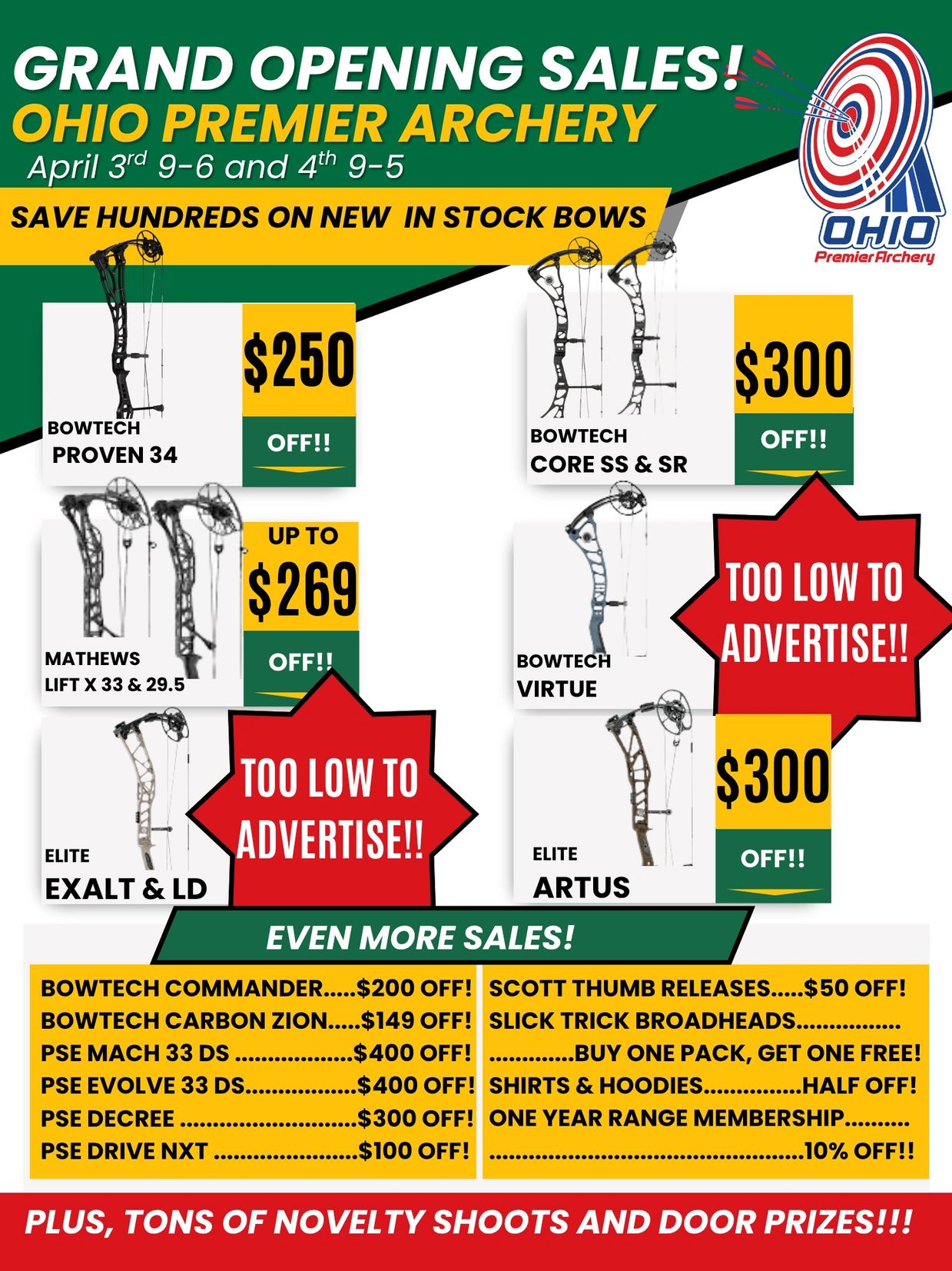 April 3rd, 9:00-6:00, and 4th 9:00 to 5:00. If you're on the market for a new bow, we've got you covered with the biggest discounts we've ever offered on bows. Not shopping for a new bow? We've still got you covered: